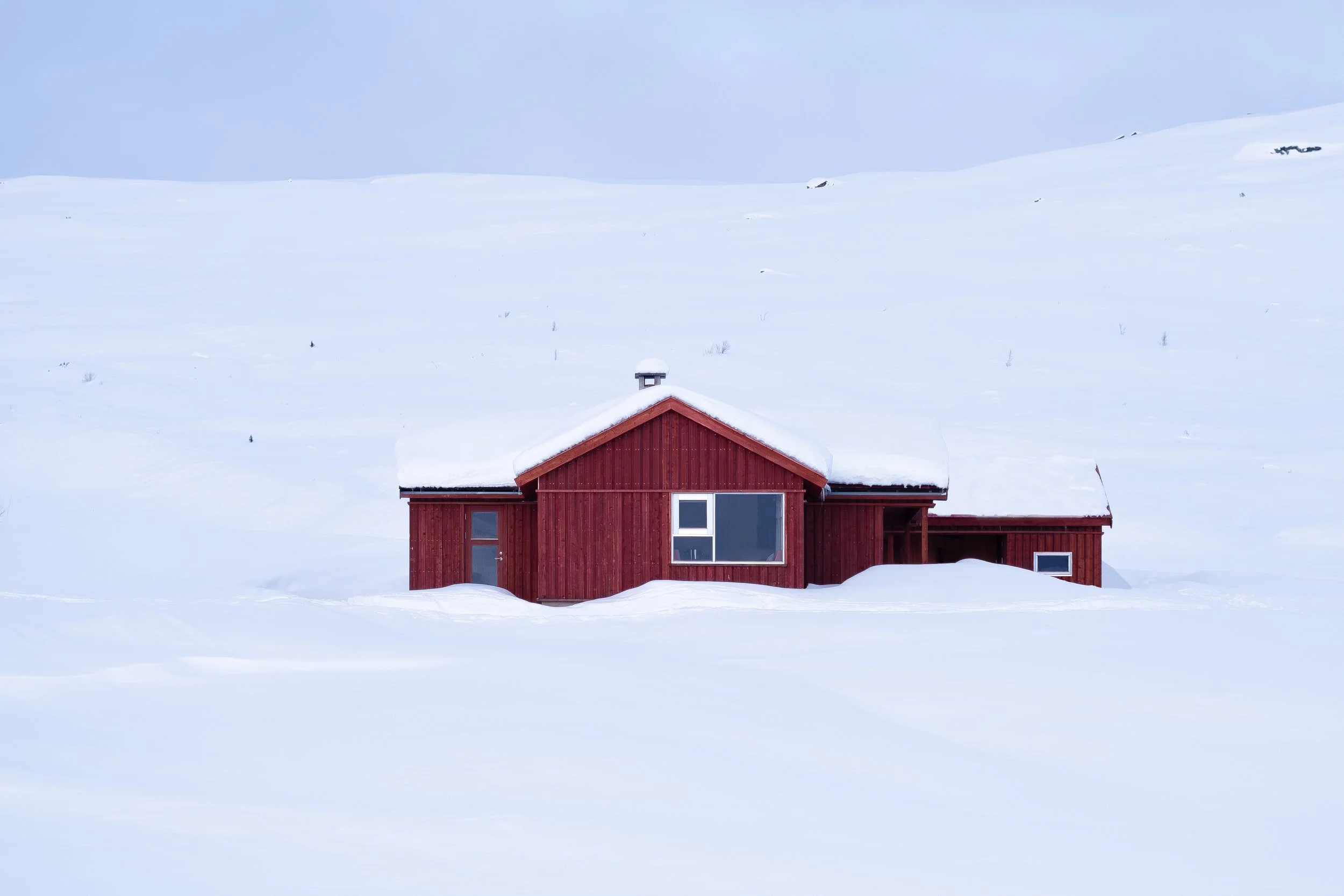 Externally, the cabin is clad with board-on-board cladding consisting of overlapping and underlapping boards of the same width. The cladding gives the facade a distinct relief effect with clear vertical shadow surfaces, which is also typical for many of the original summer farms in the area. The building is painted in a deep red color, based on color analysis of the original structure, and the roofs are finished as painted wooden roofs with a pitch of 27 degrees and the same color scheme.