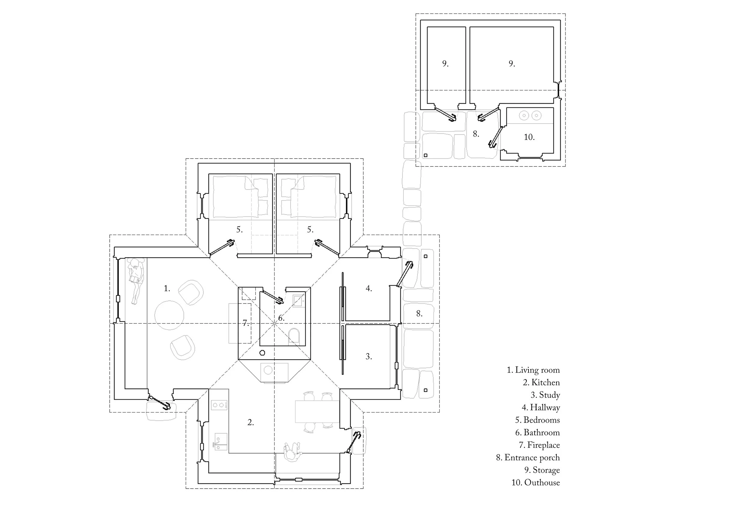 The new farmstead consists of a main building of 70 m2 as well as an outbuilding of 20 m2 built-up area - corresponding to the maximum permitted size for development in the area. For the main building, the layout is resolved within a symmetrical cross-shaped plan. The main building functions as an architectural anchor to the original farmstead that had to be demolished. The former development consisted of two gable roof volumes, and by continuing this into a full cross-shaped plan with two overlapping gable roofs, the historical orientations and the original placement on the site are maintained. In addition, a new axis toward the west is introduced, which is important regarding living quality, views, and solar conditions.
